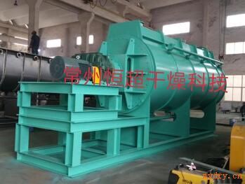 圓盤干燥機與其他間接干燥設備相比具有,傳熱面積大,攪拌效果好,更能促進水分的蒸發和去除等優點,是新開發的一款改良型簡接加熱干燥機。轉盤式干燥機主要是由定子(外殼),轉子(轉盤)和驅動裝置組成。轉子中心軸是干化轉盤的承載部件,它是一個中空軸,所有的轉盤焊接在這個空軸上。圓盤干燥機通過轉盤邊緣的推進/攪拌器的作用,污泥被均勻緩慢地輸送通過整個干燥機,并通過與轉盤的熱接觸被干化。在干化過程中,熱蒸汽冷凝在轉盤腔的內壁上,形成冷凝水。冷凝水通過一個管子被導入中心管,^終通過導出槽導出干燥機。在每兩片轉盤之間裝有刮刀,刮刀固定在外殼(定子)上。刮刀可以疏松盤片間的污泥,使廢蒸汽快速離開污泥。干燥機的傳熱介質一般是0.2Mp~0.6Mpa的飽和蒸汽。圓盤式干燥機每片轉盤由兩個對扣的圓盤焊接而成。中心軸內腔與所有轉盤內腔相連通。為了提高轉盤的堅固性,空心轉盤內腔分部著許多支撐桿,支撐桿兩端支撐著左右兩個圓盤。根據所干化物料性質的不同,轉盤可以采用低碳鋼,不銹鋼,或特殊合金鋼制造。在轉盤邊緣裝有推進/攪拌器,它們有兩個功能:一是推進輸送物料,二是攪拌混合物料。推進器的傾角是可以調整的,轉盤的內腔可以通入中低壓蒸汽,導熱油或高壓熱水傳遞干化產品所需熱量。