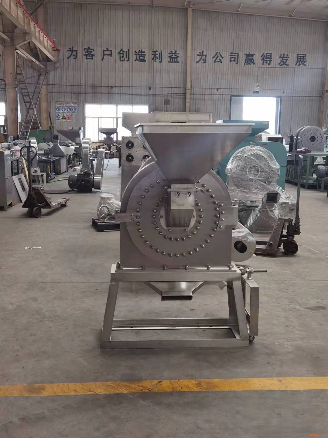 食品304材質(zhì)不銹鋼粉碎機 山東不銹鋼粉碎機 磨粉機溫馨提示→ 1、使用前,先檢查機器所有緊固件是否擰緊。 2、主軸運轉(zhuǎn)方向符合防護罩上所示箭頭方向,否則將損壞機器。 3、檢查電器是否完整。 4、檢查機器粉碎室內(nèi)有無金屬等硬性雜物,否則會打壞刀,影響機器運轉(zhuǎn)。 5、物料在粉碎前一定要檢查純度,不允許有金屬硬雜物混入,以免打壞刀或引起燃燒等事故。 6、機器上的油杯應經(jīng)常注入潤滑油,保證機器正常運轉(zhuǎn)。 7、停機前停止加料,如不繼續(xù)使用。 8、定期檢查刀同篩網(wǎng)是否損壞,如有損壞,應立即更換。 9、使用時機體會有微小振動,一定要將機蓋連接手柄擰緊,避免事故發(fā)生。 不銹鋼粉碎機注意事項: 1.本機在外接電源應根據(jù)機器功率加裝合適的斷路器,目的是在機器負荷過大,電流過大時自動切斷電源,以保護電機! 2.本機在工作時確保有專人看管。 3.被粉碎的物料顆粒不宜過大,如遇悶機,應該馬上斷掉電源。 4.如果被粉碎的顆粒過大,應該要經(jīng)過破碎后,再用本機粉碎。 粉碎機、不銹鋼除塵粉碎機,根據(jù)用戶的特殊使用要求和被粉碎物料的特殊物理、化學性質(zhì)可以加裝水冷裝置。如果被粉碎物料的熔點較低、受熱易發(fā)軟、發(fā)粘,從而造成降低粉碎效果或者無法粉碎,這就有必要在粉碎設備上加裝水冷降溫裝置。常用的水冷裝置就是在粉碎腔的前壁和后壁分別加裝一個密封的水夾,使流動的自來水或者井水不斷地流進后壁水夾,再流進前壁水夾,再由前壁水夾回流入后壁,由后壁的出水口流出。水冷裝置的目的就是降低粉碎腔的溫度!